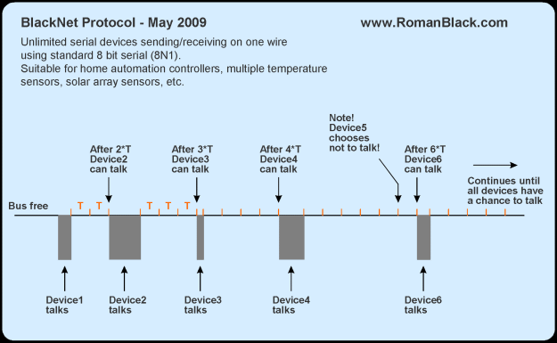 The BlackNet bus data line is both a transmit and receive line, for all devices.