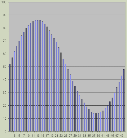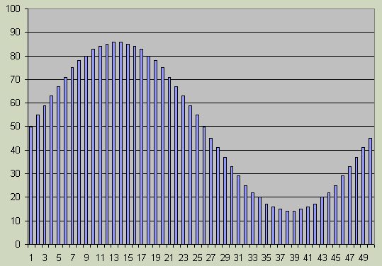 The sinewave is generated by a 50 entry sinewave table for the complete