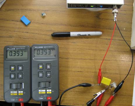 Above you can see the 0.22uF cap under test, both meters reading 393mV.