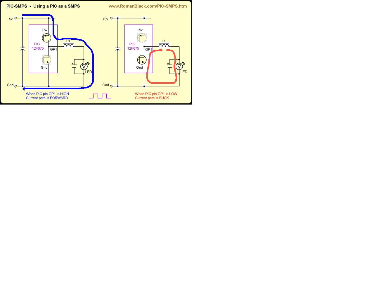 The picture above shows the simplest PIC-SMPS system. The PIC is powered
