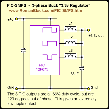 5v to 3.3v converter but this one uses 3 inductors and each is driven from a