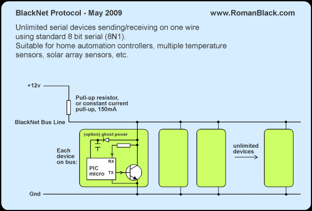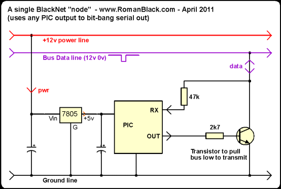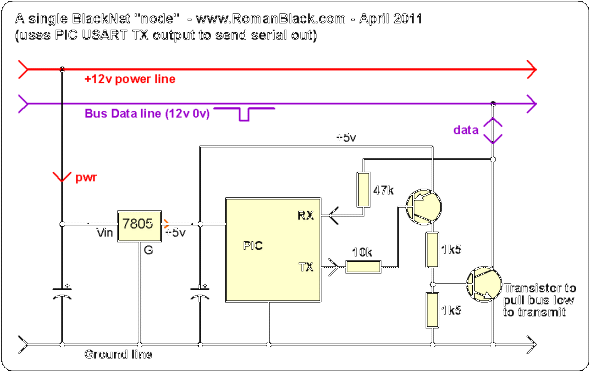 The BlackNet bus data line is both a transmit and receive line, for all devices.