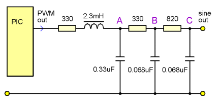 The PWM output from PIC pin RB3 was filtered through a 1k trimpot and