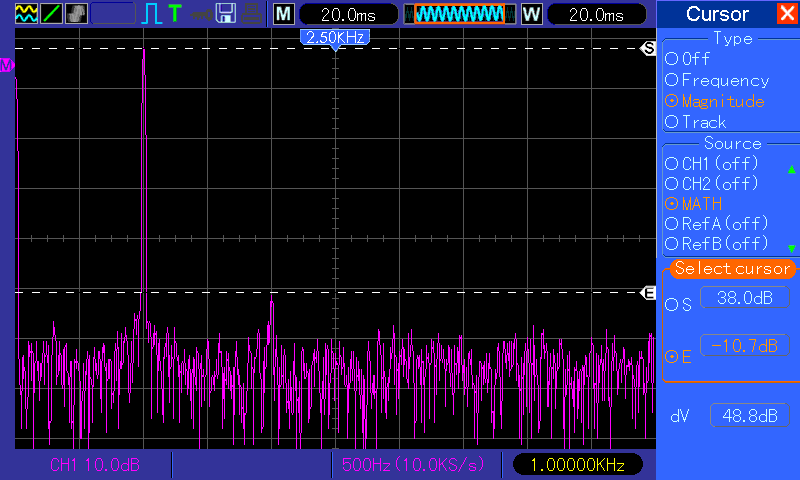Above in the spectrum analyser you can see with a 1kHz sine, the