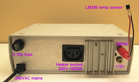 The back panel, left to right; dual RCA socket used for LM335 sensor and 12v out