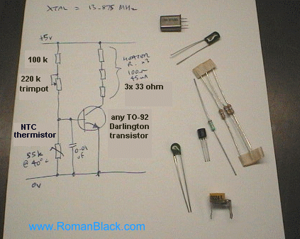 cheap NTC thermistor (I used DickSmith 100k type, =55k @ 40'C)